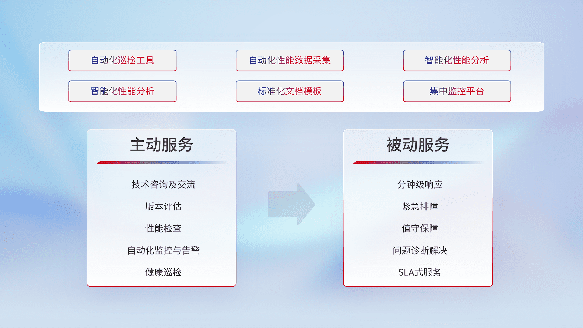 智能化工具和标准化文档,,保障服务质量,,提供主动服务(包含技术咨询、、、、版本评估、、、、性能检查、、、自动化监控与告警、、、健康巡检)和被动服务包含(分钟级响应、、紧急排障、、值守保障、、、问题诊断解决、、、、SLA服务)。。。。